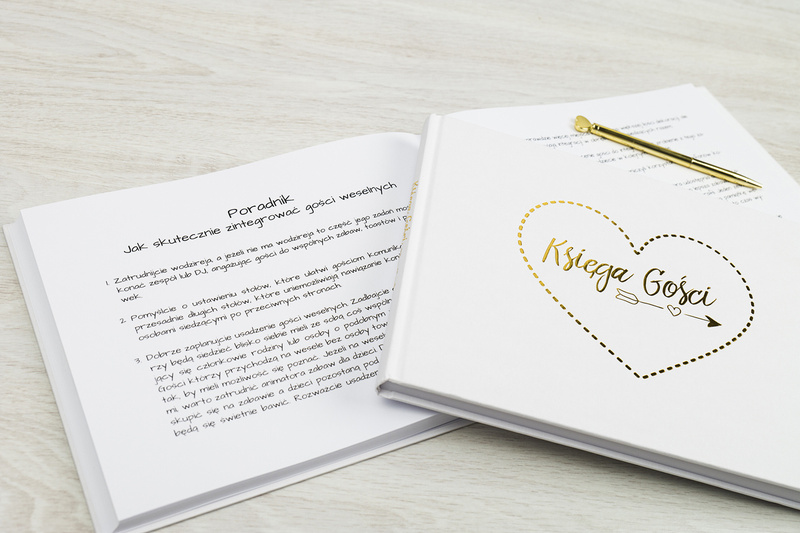 100 stron wysokiej jakości papieru. Grube kartki o gramaturze 150g. Pierwsza strona to miejsce na wpisanie imion Państwa Młodych i daty ślubu. Na ostatnich pięciu stronach znajdują się bardzo pomocne porady jak zintegrować gości weselnych wraz z pomysłami na zabawy integracyjne.
