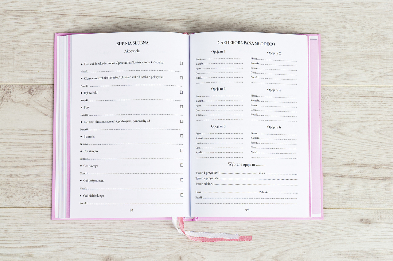 Wersja w szytej oprawie książkowej, która dodatkowo zawiera dwie satynowe tasiemki do zaznaczania. Idealny wybór dla Panny Młodej, która chce mieć wszystkie szczegóły ślubu w jednym, pięknie zaprezentowanym i funkcjonalnym organizerze.